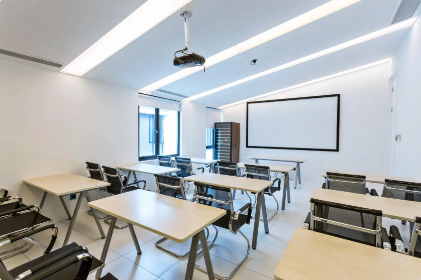 - Furnished with standard student desk and chairs, white board, projector, etc.,